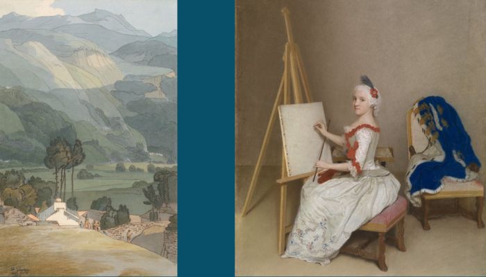 Pruissisch blauw en Pompadour-roze. Een specifiek palet en de ontdekking van nieuwe kleuren zegt veel over maatschappelijke waarden en ideeën in de achttiende eeuw. Ook de gebruikte materialen geven inzicht daarin. Zo is er de ‘pastelgekte’. Rond 1750 bereiken pastels een ongekend hoogtepunt in populariteit en waardering. De droge, satijnachtige pigmenten, vervaardigd in staafjes van elke kleur, zijn draagbaar en maken een snelle uitvoering mogelijk. Vanaf 1760 wordt de aquarel een gevierde kunstvorm. Zowel pastelkrijt als aquarel zijn gemakkelijk mee te nemen op lange tochten als de Grand Tour.